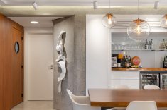 Tomando partido da beleza própria dos materiais, o profissional focou em ações pontuais, entre elas, revelar a robusta estrutura de concreto, fazer uso do vidro, do ferro, da madeira e da pedra para revestir e diferenciar planos e elementos. A situação do projeto original, antes da reforma, era a de uma planta obstruída por paredes e móveis fixos. “O apartamento apresentava uma paleta de cores escura, piso laminado de madeira, restrições de iluminação natural e artificial.