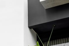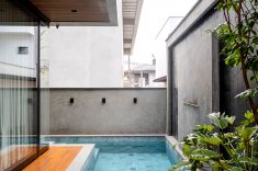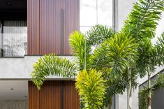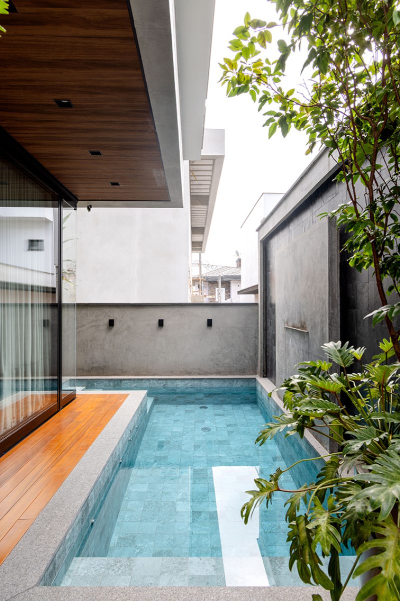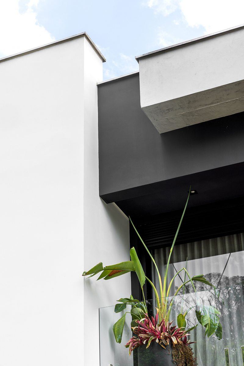 Neste projeto do Studio Kaza, elementos retos e limpos avançam, recuam e se sobrepõem. O volume superior funciona como uma peça em “C” parcialmente aberta, que enquadra o vazio central (varanda/abertura). Já o bloco lateral mais alto e o plano horizontal formam uma espécie de “L” estrutural que ancora visualmente o conjunto, evitando que a casa se transforme em um bloco único com cara de caixa simples. Também pesa muito na proposta a mistura equilibrada de concreto que reforça o aspecto urbano e a madeira que aproxima a casa de uma escala mais acolhedora. A vegetação abraça o conjunto e ajuda a integrar os volumes à paisagem, suavizando a leitura do conjunto.
