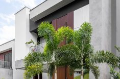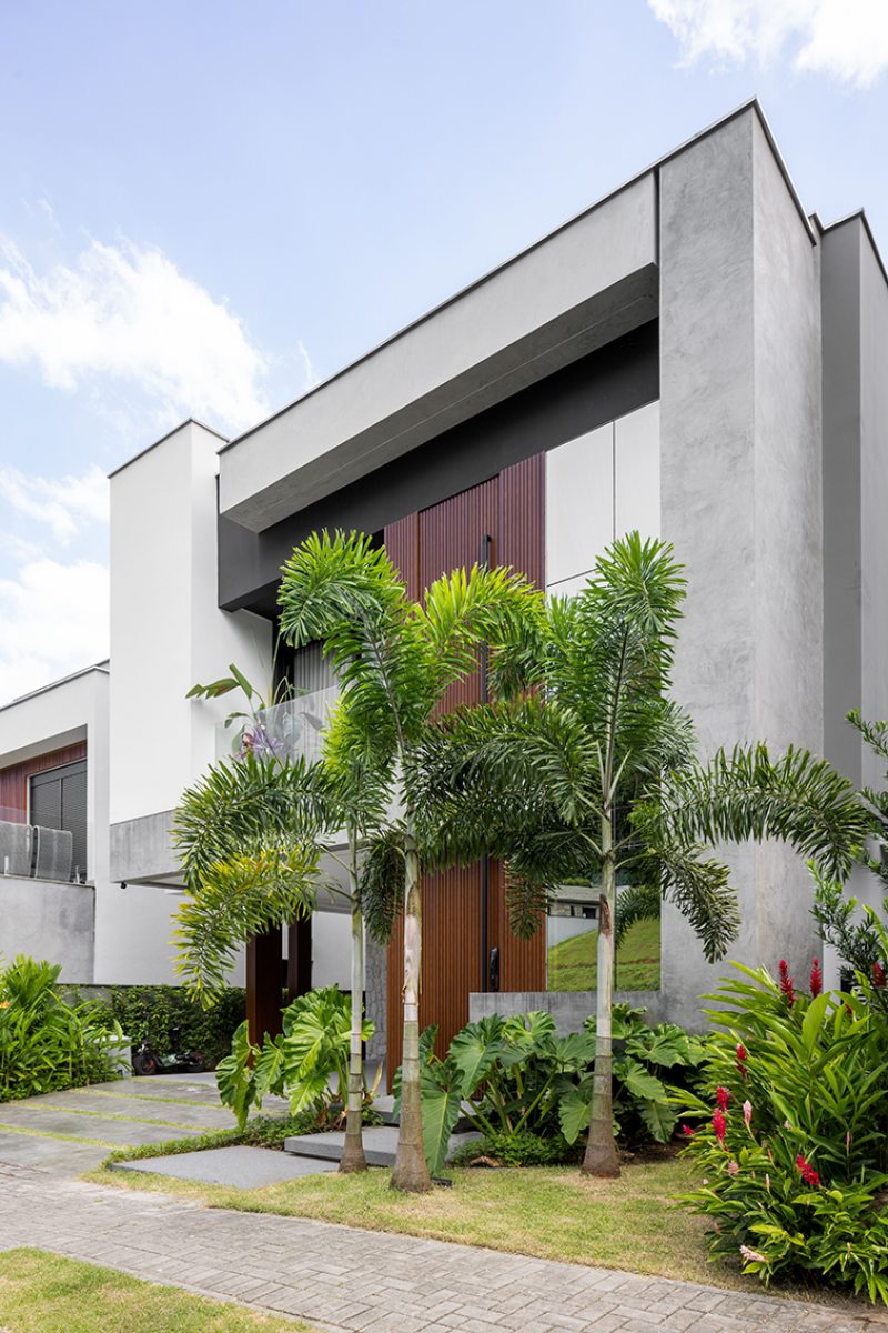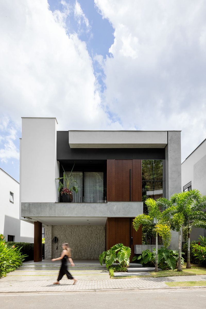 Um tipo de fachada tem se repetido em projetos recentes e indica a preferência por casas com volumetria simples, mas com leitura forte. Em vez de muitos elementos, a casa ganha identidade a partir de volumes que avançam e se encaixam, criando profundidade sem complicar o desenho. A escolha de poucos materiais, aplicados de forma bem-marcada, reforça essa leitura mais direta, batizada de arquitetura contemporânea minimalista ou até “modernismo tropical”, quando incorpora vegetação e materiais naturais.