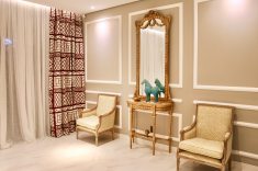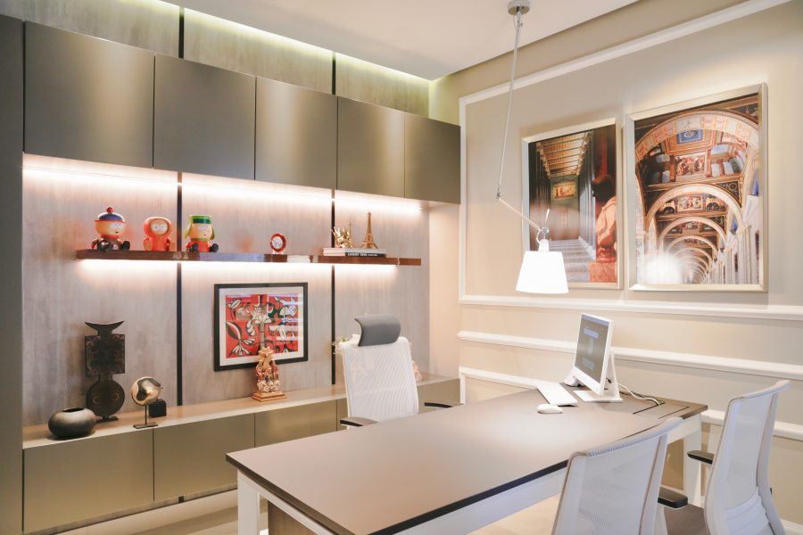Para agradar ao estilo de alto padrão dos clientes da imobiliária, os sócios utilizaram produtos de luxo desde o acabamento às peças de decoração. O projeto teve a curadoria do artista plástico Eleuthério Netto, que trouxe objetos vintage, como a mesa antiga de mármore, luminárias em acrílico que foram usadas em cinemas de São Paulo nos anos 50 e o lustre Murado com pó de ouro dos anos 70. “Também utilizamos um mobiliário contemporâneo, como o sofá italiano e as cadeiras do design Gustavo Bittencourt, mostrando, sem extravagância, o alto padrão da empresa”, comenta Mutao. Os ambientes também foram compostos por peças da Funcional Móveis, com o apoio de um projeto luminotécnico que valoriza as peças e proporciona ainda mais sofisticação aos ambientes.
