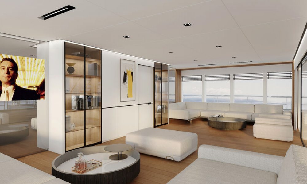 A bordo, o design impressiona. São três amplos deques conectados por uma arquitetura fluida e cheia de aberturas que integram interior e paisagem. O convés principal abriga uma piscina de 5,5 metros, rodeada por espreguiçadeiras e um bar — nada mal para um pôr do sol cinematográfico.