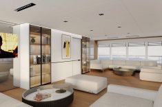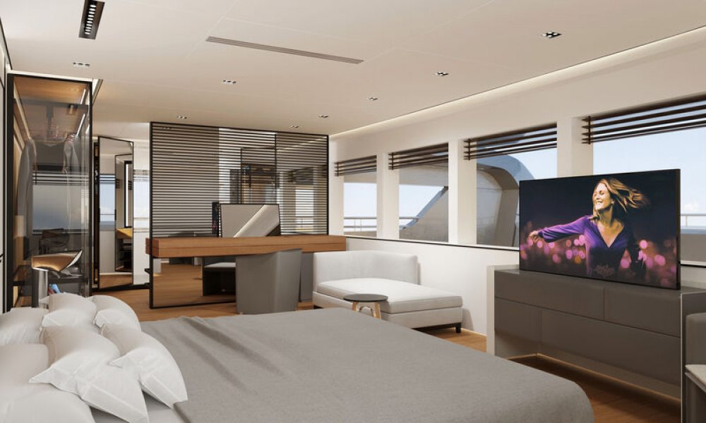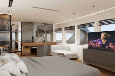 No interior, o conceito de biofilia dita o estilo: uso de materiais naturais, iluminação abundante, janelas panorâmicas e uma paleta que remete à natureza. Ao todo, o iate acomoda oito hóspedes com muito conforto, em quatro suítes, incluindo uma cabine master com terraço privativo. A tripulação? Até quatro pessoas para atender aos convidados com total exclusividade.