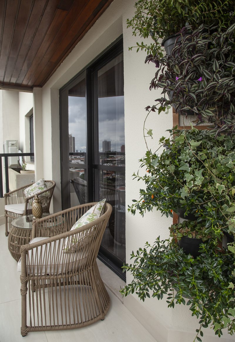Para a varanda, Carina implementou soluções simples e que proporcionaram um espaço de descanso para os moradores. Para contemplarem a vista privilegiada, o espaço não foi fechado com vidros ou telas. A varanda também recebeu duas poltronas com material próprio para a área externa – aqui, eles vivenciam o encontro direto com o frescor da natureza sem sair da cidade!