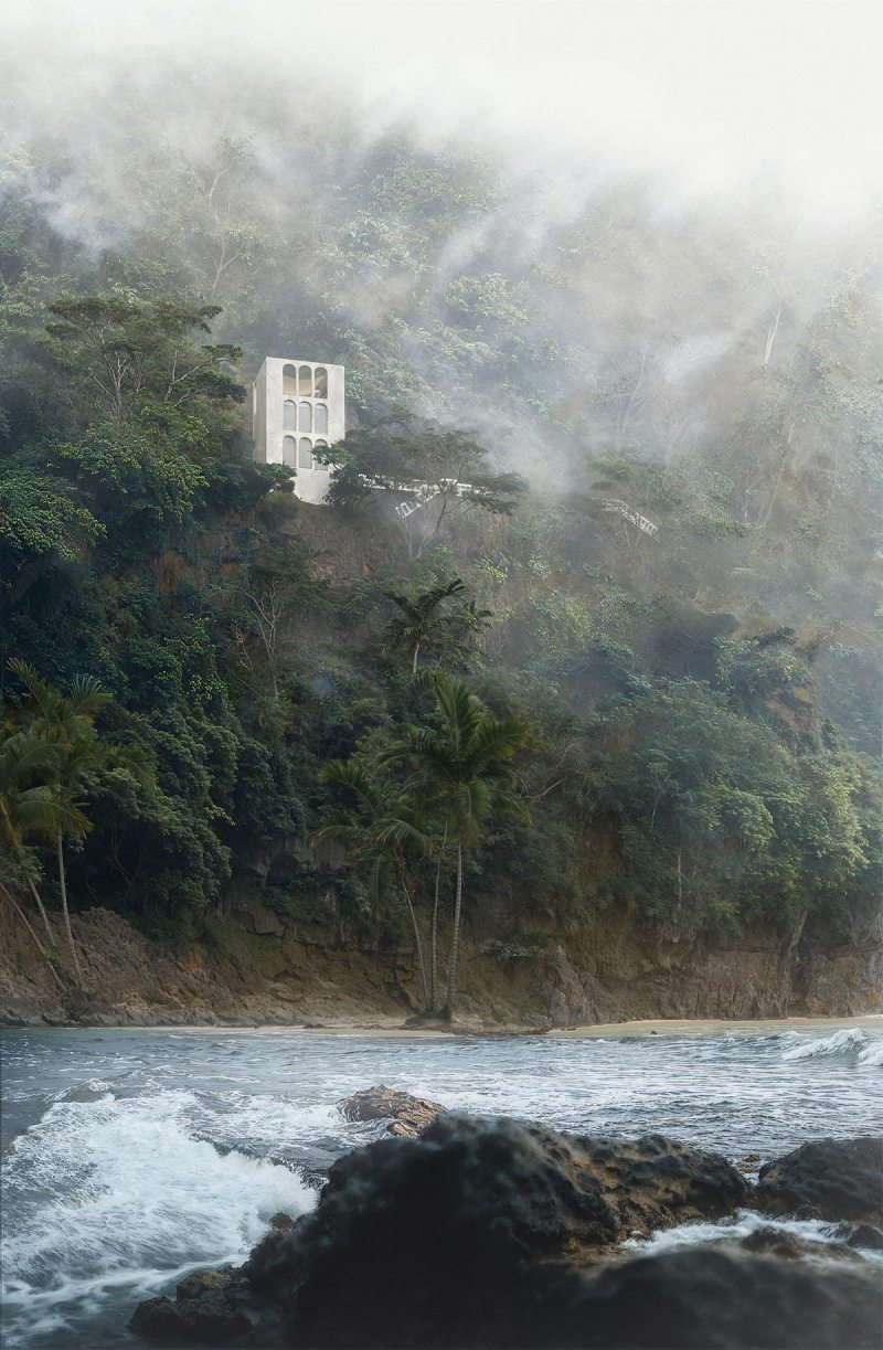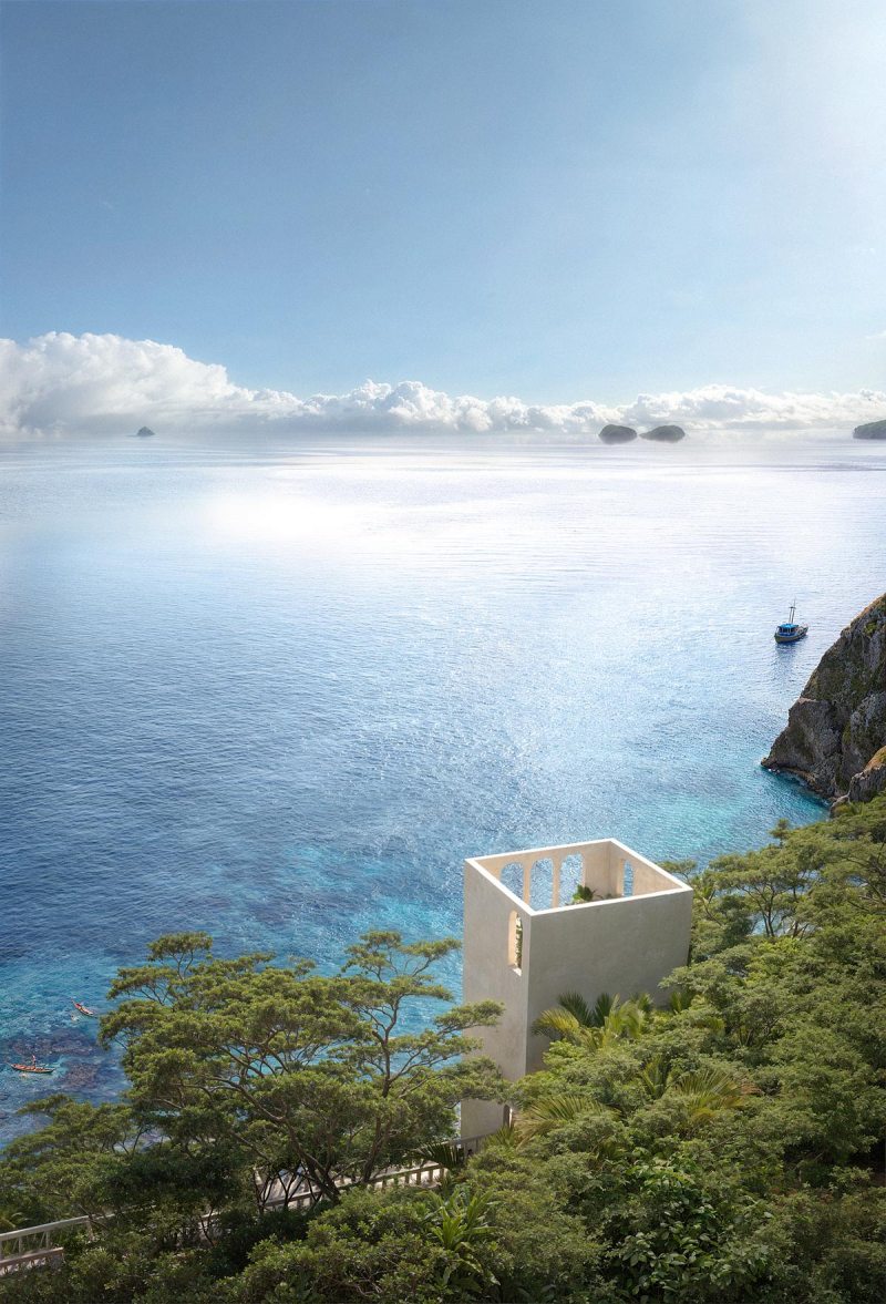 A West Boracay Bungalow, como é conhecida, enfatiza o minimalismo, com todo o volume revestido em pedra de origem local, criando continuidade visual com a geologia da encosta. O pavimento superior aparenta flutuar sobre o desnível natural, sustentado por estruturas ocultas que reforçam a leitura leve do conjunto, mesmo diante da materialidade maciça.
