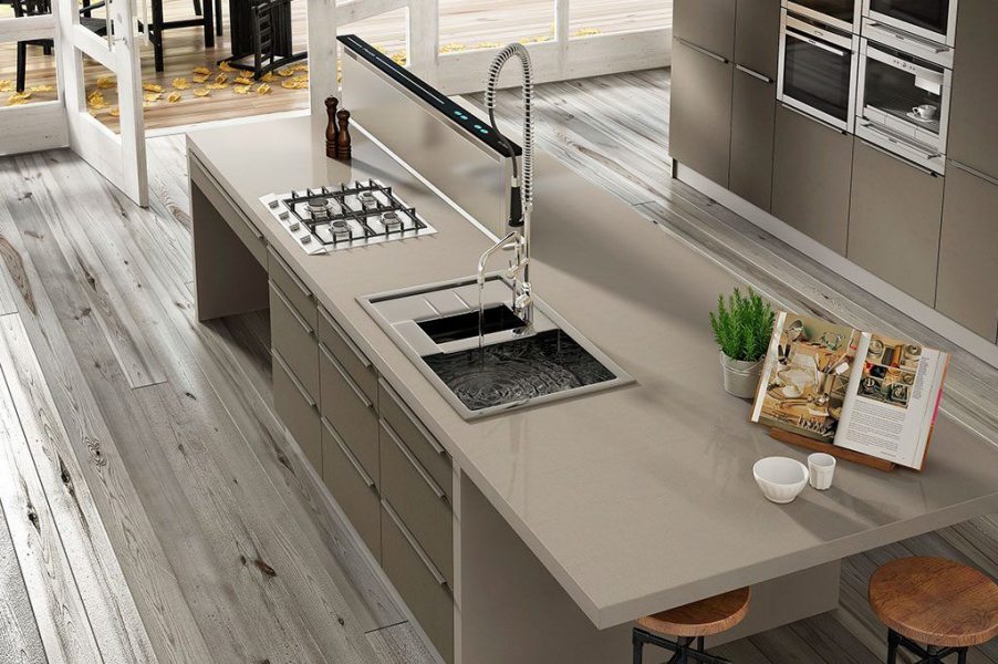 Quartzo industrializado – Silestone (superfície composta de quartzo e resina): boa resistência e grande variedade cromática, mas não tolera bem altas temperaturas.