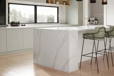 Já Pauline Kubiak vê na sinterizada a melhor resposta às limitações da pedra natural: “Indico a Neolith Classtone, que lembra o mármore branco Paraná, mas sem as manchas e com resistência ao calor. O mármore natural, por ser poroso, acaba manchando com pouco tempo de uso”.