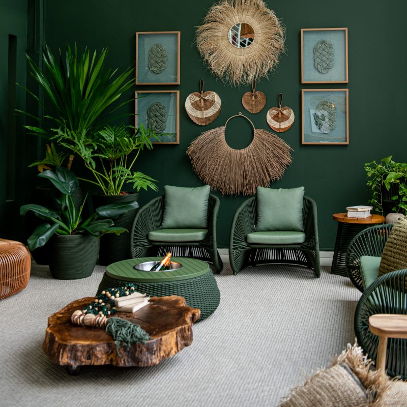Com inspiração na Natureza, Luciana buscou no verde a sensação de paz e relaxamento presentes em suas memórias de férias na fazenda e trouxe elementos rústicos aplicados com elegância como o sofá em fibra natural e a mesa de centro em madeira bruta que deixou o espaço ainda mais acolhedor. Em um grande living, os sofás com linhas predominantemente curvas em tonalidade verde criam um espaço fluído e harmonioso arrematado por vasos e plantas que garantem a energia e vitalidade do espaço. A mesa de centro champanheira é um convite a esta celebração. “A Raffinato evoluiu muito ao longo desses 23 anos, e esta busca por evolução contínua pode ser percebida em seus produtos através do design, da qualidade e da versatilidade que busco para dar personalidade aos meus projetos.” comenta Luciana Baggio.