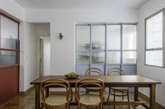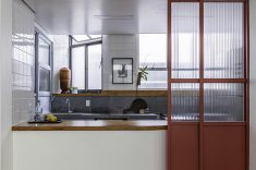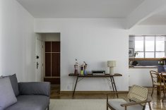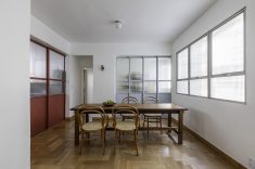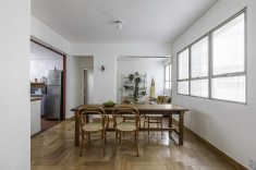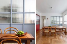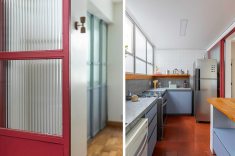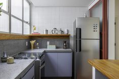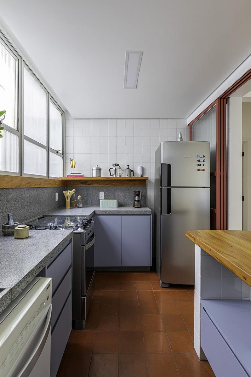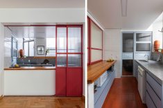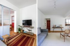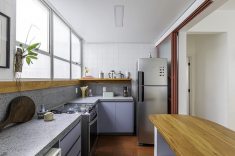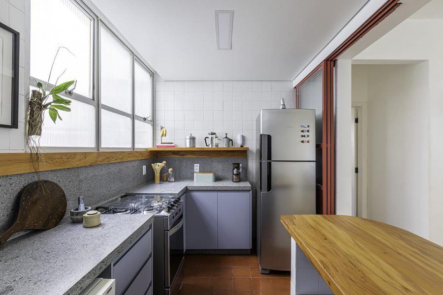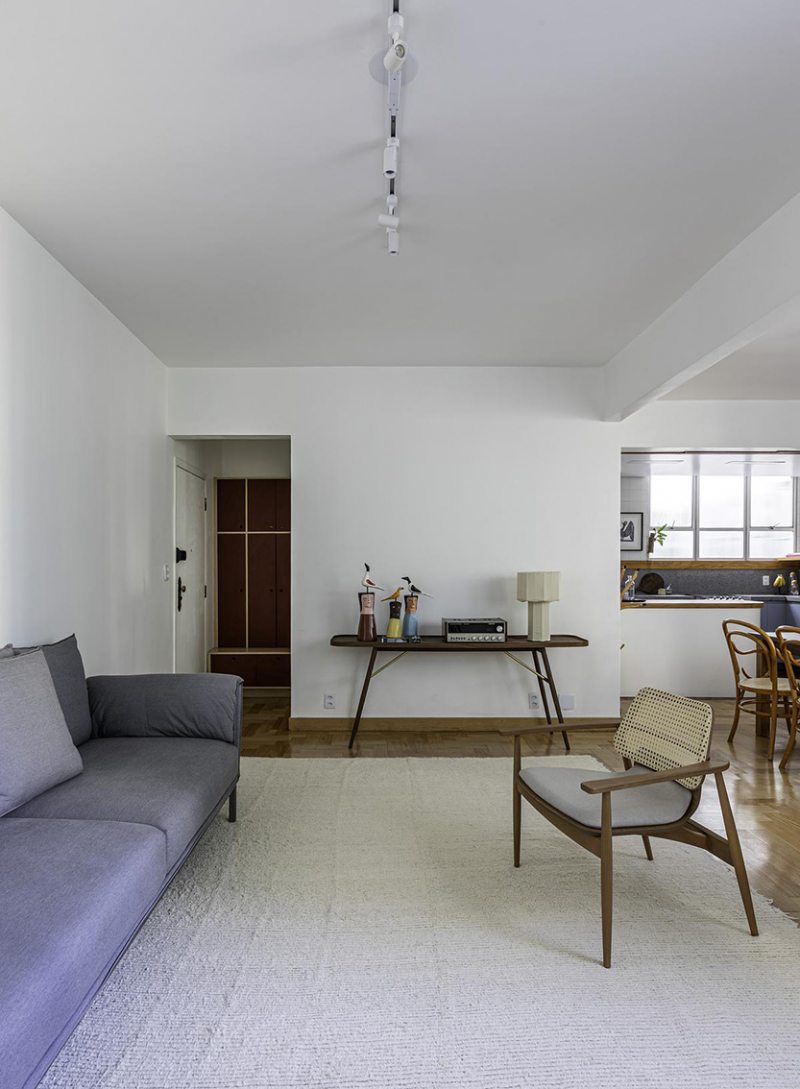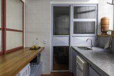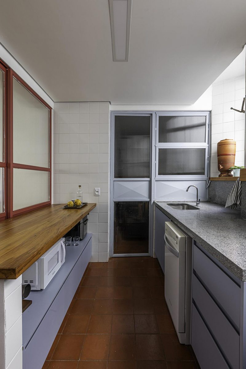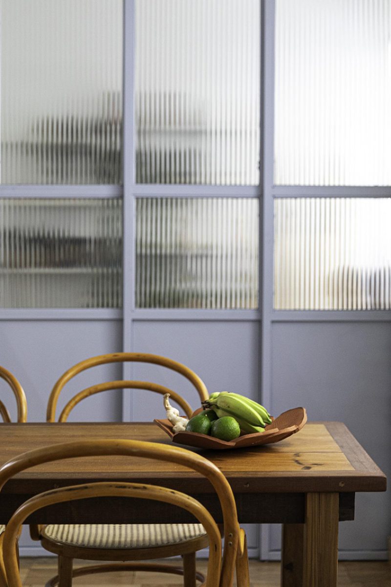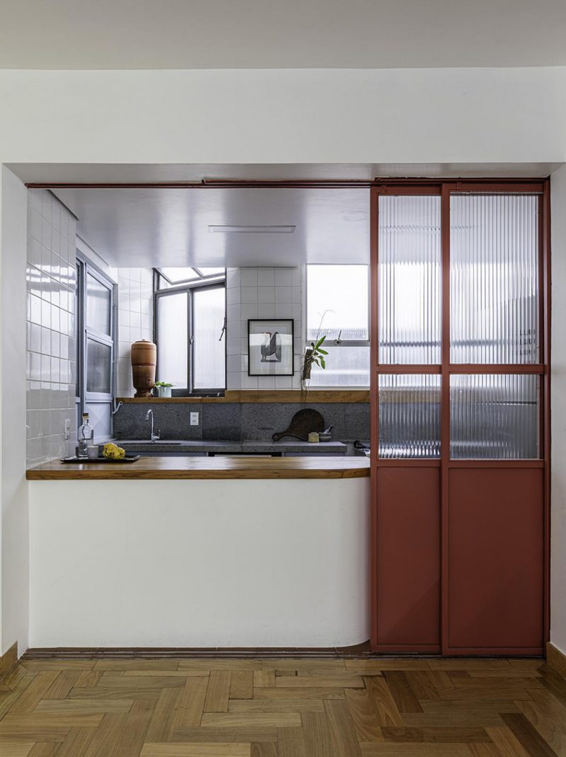 O projeto teve como foco otimizar os ambientes, ampliar a área social e integrar os espaços de forma fluida e reversível. A cozinha, antes isolada, ganhou protagonismo: o antigo banheiro de serviço foi demolido e a lavanderia, compactada. Esse gesto permitiu que a cozinha se abrisse para a sala de jantar, conectando-se aos encontros e rituais cotidianos dos moradores. Uma grande porta de serralheria com vidro canelado foi desenhada para oferecer privacidade quando necessário, mas sem perder luz ou leveza visual.