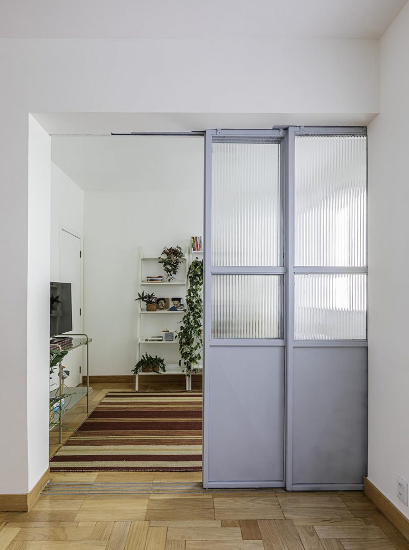 Um dos quartos foi transformado em sala de TV, ampliando a área social e oferecendo versatilidade ao uso do apartamento. Através de uma terceira porta de serralheria com vidro canelado, o espaço pode se converter em quarto de hóspedes com facilidade: um recurso que revela a preocupação com a multifuncionalidade, sem perder o caráter visual coeso do conjunto.